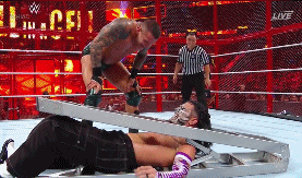 Orton estuvo bastante molido al final del encuentro, tal vez sea por ello, pero Hardy se animó a una temeridad: armó dos escaleras y una mesa, posó a Orton en la mesa, subió las escaleras,