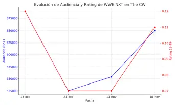 El año pasado por estas fechas, el episodio de NXT del 19 de noviembre de 2024 registró 672.000 espectadores y una calificación de 0,19 en The CW. El episodio de NXT del 21 de noviembre de 2023 registró 622.000 espectadores y una calificación de 0,19 en USA Network.