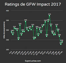 A continuación, les presentamos una relación de los ratings de Impact en los últimos meses. Hay que hacer notar que la nueva era de Impact inició en el episodio del jueves 9 de marzo. En aquella ocasión, Impact tuvo una audiencia de 309 mil espectadores.