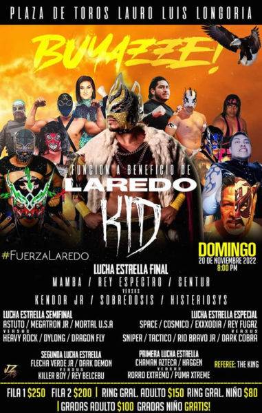 Entre los luchadores más destacados se encuentran Mamba, Rey Espectro, Kendo Jr., Sobredosis y otros. El evento tendrá cinco combates y todo lo recaudado será para ayudar Laredo Kid.