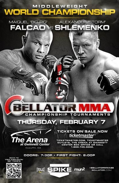 El día de ayer, 8 de Febrero, en la Arena Gwinnet Center de Duluth, Georgia, se realizo un nuevo evento de Bellator MMA, en donde destacaba la pelea titular de peso medio entre Alexander Shlemenko vs. Maiquel Falcao. El Ruso se impuso a Falcao vía nocaut a los 2:48 minutos del segundo round, ganando así el cinturón de los pesos medios que había dejado vacante Hector Lombard al marcharse a