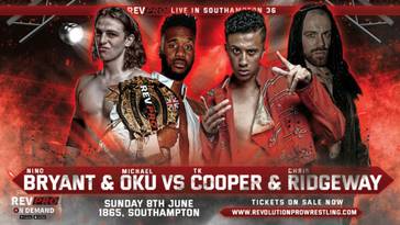 - TK Cooper y Chris Ridgeway derrotaron a Michael Oku y Nino Bryant. Un combo de cabezazos de Cooper sobre Oku acabó con el Campeón Británico Indiscutible de Peso Completo RevPro encajando la cuenta de tres, sorprendido al desconocer que el miembro deSunshine Machine había hecho el tag. Resultado bastante sorpresivo y por ende, valiente. RevPro pudo programar que Bryant o Ridgeway fuesen puestos de espaldas planas, pero de esta manera, potenció lo máximo posible la imagen de retador de Cooper antes de medirse a Oku en Revolution Rumble.Anuncio