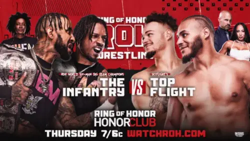- Top Flight (Dante y Darius Martin) (con Christopher Daniels y Leila Grey) derrotaron a the Infantry (Shawn Dean y Carlie Bravo) (con Trish Adora). El segundo encuentro más largo del episodio, con un buen desempeño de los implicados. The Infantry buscaron represalía en las postrimerías, ayudados por Shane Taylor, y Scorpio Sky hizo el salve. Shane Taylor Promotions defenderán el Campeonato Mundial de Tríos ROH ante SkyFlight en Final Battle.Anuncio