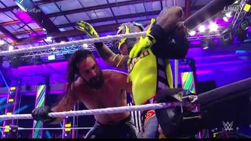 Afuera del ring, Rollins busca una silla eléctrica y Mysterio lo hace estrellarse contra la barrera. Luego, el enmascarado regresa, toma impulso y conecta un Sunset flip estrellando a Rollins contra la barrera metálica.