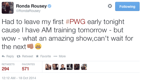 Ronda no pudo quedarse toda la función, pues en esos meses estaba entrenando para enfrentar a Cat Zingano (de hecho lo publicó en un Tweet ese mismo día)