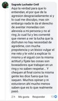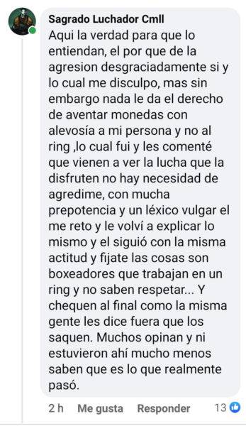 Posteriormente, en redes sociales Sagrado explicó lo sucedido y ofreció disculpas, aunque también criticó a los aficionados a quienes identificó como boxeador.