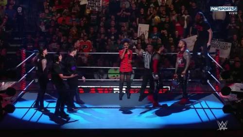 Pero, Sami Zayn tomó el micrófono y pidió que lo dejaran hacer equipo con Jey Uso. Pearce aprobó este cambio, así que un fresco Sami Zayn entra a la lucha a buscar la victoria para The Bloodline y se amra la gorda. Zayn le da derechazos a Dominik y lo saca del ring, luego le baja la soga a Priest y el de Puerto Rico cayó fuera. Sami Zayn se arrojó con una Plancha hacia fuera del encordado y conectó a sus rivales. Los fans lo aman y corean «Sami».