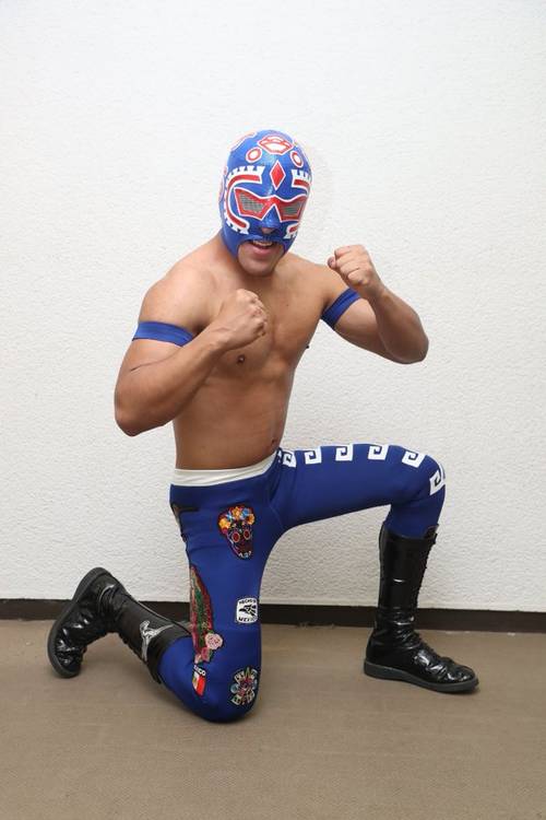El joven luchador mexicano enmascarado, Sangre Azteca Jr., hizo su debut con este personaje en la empresa japonesa independiente Michinoku Pro Wrestling.