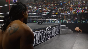 Santos Escobar subió a lo más alto, pero para sorpresa de todos, Devlin regresó. Ambos comenzaron a golpearse en lo más alto, hasta que finalmente el mexicano consiguió empujar a su rival quien quedó golpeado sobre las escaleras.