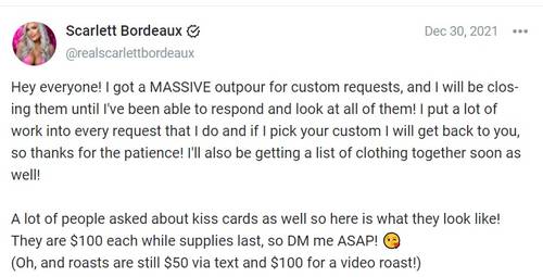 Los creadores también pueden realizar videos personalizados para cada uno de sus fans, que es precisamente una de las prácticas de Scarlett Bordeaux. Sin embargo, ha tenido que parar de realizarla temporalmente debido a la alta demanda entre sus seguidores. Ella misma acaba de anunciarlo: