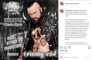 «¡Rack Attack Promotions se enorgullece de dar la bienvenida a Tommy End a The Big Event! Venderemos 100 Combos a una tarifa de $70 que incluirán un autógrafo (artículo propio) y una foto con Tommy End. Reservar tus combos te GARANTIZARÁ encontrarte con Tommy End en el intervalo de tiempo asignado. Una vez que se hayan realizado todos los combos de pedidos por adelantado, cualquier día de ventas será de $40 por una sesión de fotos y $40 por un autógrafo de Tommy End. Efectivo solo en la mesa el día del espectáculo (si el tiempo lo permite).