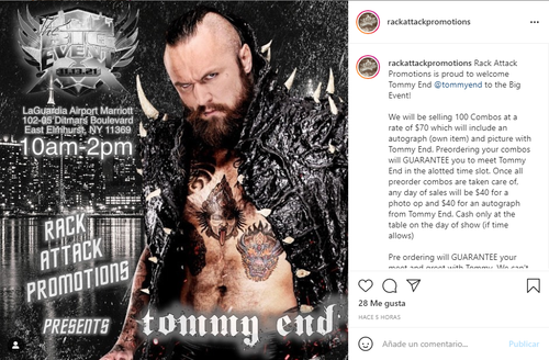 «El pedido por anticipado GARANTIZARÁ su encuentro y saludo con Tommy. No podemos garantizar que el día de los pedidos esté disponible. Se aceptarán pedidos por correo, envíe un mensaje para obtener más detalles. Lamentablemente, no firmará su figura NXT TAKEOVER Elite, pero firmará cualquier otro artículo que puedas tener. Pedimos disculpas por las molestias. ¡Queríamos hacer nuestro debut en el gran Big Event (juego de palabras) y no había mejor manera que hacerlo que con TOMMY END conociendo y saludando a todos los fanáticos en el área de Nueva York!».