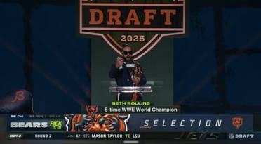 «Déjenme recordarles que soy un visionario, soy un revolucionario, soy Seth ‘Freakin’ Rollins, y estoy aquí para decirles que con la selección número 56 del NFL Draft 2025, la franquicia más grande en la NFL, los Chicago Bears, seleccionan a Ozzy Trapilo, tacle de Boston College.«