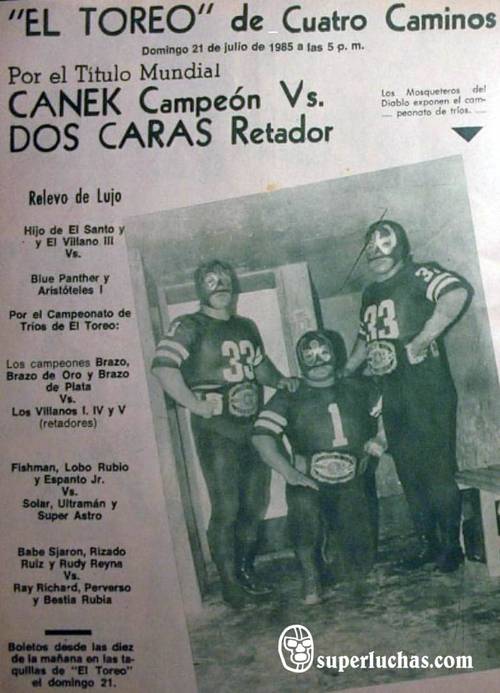 - En la lucha lestelar Canek expuso y retuvo el Campeonato Mundial de Peso Completo UWA ante su retador, Dos Caras. Quien no pudo arañar al monarca. La reseña de ese día indicaba:
