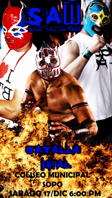 Por Mauricio Rubiano: Hola amigos de Súper Luchas – Superluchas.net: Este próximo sábado 17 de diciembre, SAW – Sociaty Action Wrestling, empresa de Colombia, realizará el evento ¡Batalla Final! Rudos vs. Técnicos desde el Coliseo Municipal de Sopó en Sopó, Cundinamarca en compañía de Karate Do Dragones en un evento en donde además se disputarán Campeonatos de