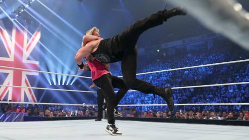«Aquí tienes la configuración estándar para la embestida en la esquina. Tienes a Edge justo aquí, y a Shelton a punto de darse la vuelta aquí. Mientras se prepara para la embestida, puedes ver que Shelton se está girando, y Shelton hace algo genial, corre hacia ella para darse suficiente espacio y poder recibir un impactante golpe en la espalda. Aquí viene Edge corriendo, Edge extiende la mano. El brazo izquierdo va a abrazar como un clothesline. Es casi como un clothesline en el estómago donde se envuelve alrededor y empuja hacia abajo. Edge golpea un poco el lado para indicar que está a punto de realizar la embestida, y luego esta mano derecha va a bajar para protegerlo a él y a Shelton, para que no tenga que agarrar alrededor de aquí, evitando que Shelton caiga sobre esa muñeca. Este brazo debería bajar justo aquí y proteger a ambos. En el último segundo, Edge baja esa mano para aterrizar en el brazo derecho y la rodilla derecha. Shelton va a tomar un buen golpe en la espalda justo ahí, y el brazo de Edge está envuelto alrededor de él, guiándolo hacia abajo para un buen golpe de espalda plana.»