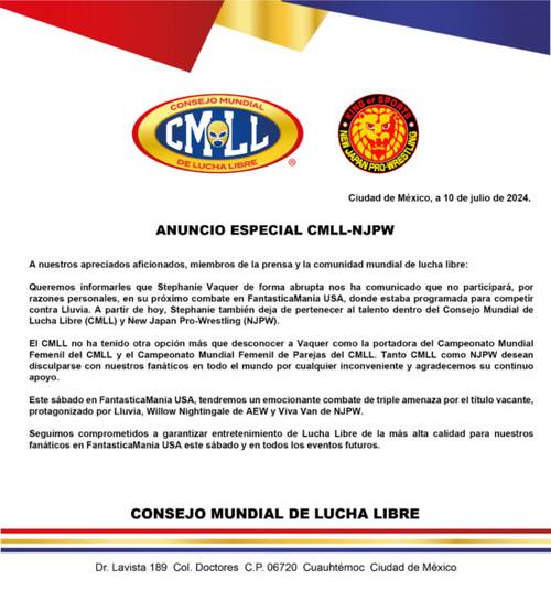 «A partir de hoy, Stephanie también deja de pertenecer al talento dentro del Consejo Mundial de Lucha Libre (CMLL)y New Japan Pro-Wrestling (NJPW).Anuncio