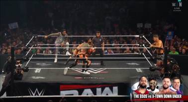 El combate inició con intensidad, con Austin Theory escapando rápidamente de Jey para dar el relevo a Grayson Waller. A-Town Down Under, aprovechó para castigar al samoano con una combinación de golpes, pero Jey logró esquivar un peligroso diving elbowdrop de Waller, permitiéndole dar el relevo a Jimmy.