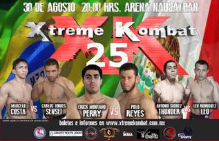A las 20:00 Hrs en la Arena Naucalpan del Estado de México estará la edición no.25 de Xtreme Kombat con la pelea estelar entre Erick «Perry» Montaño de Bonebreakers México D.F. vs. Polo «Torito» Reyes de Bull Fighters de Guadalajara, Jal.