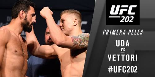 Combate dirimido en la categoría de peso medio. Vettori es una de las jóvenes promesas italianas que llega a UFC con un récord de 10-2 que incluye 5 victorias consecutivas. Por su parte, el brasileño Uda se 1destaca por su dinamismo en el octágono; sin embargo esto no fue suficiente para que rápidamente fuera sometido en el suelo, donde Vettori se desenvolvió perfectamente