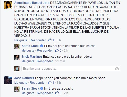 Si bien algunos fanáticos creen que la firma de Sarah Stock con WWE incluye verla lucha en un futuro, su contrato no está diseñado así. Ella solo se encargará de formar a las aspisrantes a nuevas Divas de WWE en el WWE Performance Center de Orlando, Florida y así lo confirmó en su cuenta oficial de Facebook: