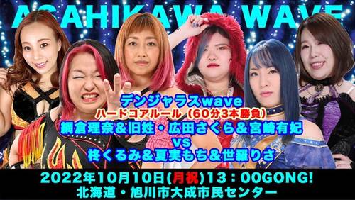 4. ASAHIKAWA Dangerous wave – 2/3 Falls Match: Yuki Miyazaki, Kyusei Sakura Hirota y Rina Amikura derrotaron a Risa Sera, Kurumi Hiragi y Mochi Natsumi (2-1) (32:56). Natsumi venció a Hirota por Pinfall (16:36). Hirota derrotó a Natsumi con la Furafura Don (1:12). Miyazaki derrotó a Sera con un Go Death Valley Bomb (15:08).