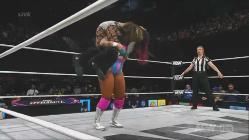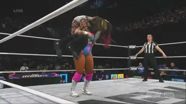 El ritmo aumentó con movimientos en conjunto: Harley sorprendió con un poderoso azotón y Willow aplicó un doble Spear para recuperar el control. Athena realizó un impresionante Fallaway Slam doble para tomar el control.