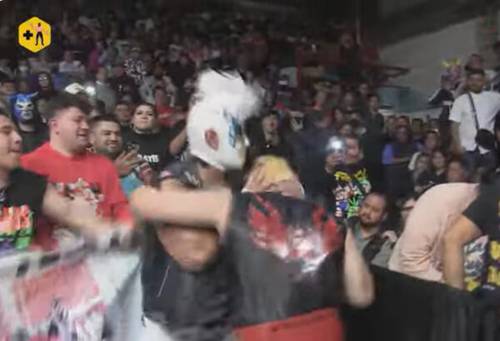 Los objetos empezaron a salir desde los primeros momentos, utilizando botellas de cerveza para abrir la frente de su oponente. El enfrentamiento no tuvo respiro, extendiéndose incluso a las gradas entre el público, provocando un estallido de emoción en la Arena López Mateos.
