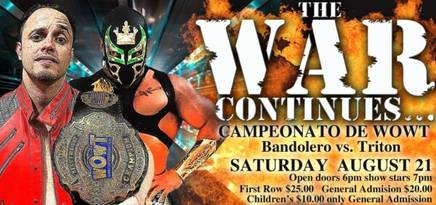 La empresa WOWT (World Of Wrestling Team) presenta THE WAR CONTINUES… este próximo Sabado, 21 de Agosto en el histórico Eagles Club en Berwyn, IL, puertas abren a las 6:00 pm y la campana suena a las 7:00 pm. En el turno estelar habrá un choque de colosos entre Apolo frente a Canek Jr. Tambien tendremos Meet and Greet con todos los luchadores desde las 6:00 pm.