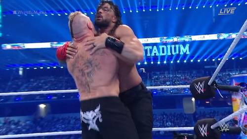 Esto fue en el evento estelar de la segunda noche de WrestleMania 38. El combate comenzó con Lesnar riendo y Reigns muy serio. Lesnar se quitó los guantes de MMA nada más tocarse la campana y golpeó a Reigns con derechazos, este reaccionó igual, pero Lesnar lo alzó y lo tiró contra el esquinero.