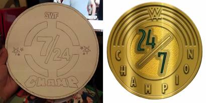 «Un año después me llevo la sorpresa que WWE debutó el ’24/7 Championship’ y fue aún más mi sorpresa cuando veo la similitudes entre este campeonato y el que yo había creado: placa circular ’24/7′ en la parte central, logo de la empresa en la parte superior, contorno delgado y la palabra champion abajo y el hecho que de jamás hice unas placas laterales explicaría por qué las del 24 son tan simples.