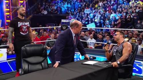 ► Roman Reigns se cansó de las palabrerías y del ego que estaba demostrando LA Knight y le arrojó la mesa encima y lo pateó varias veces en el esquinero. Luego,