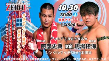 Fuminori Abe de BASARA hizo la segunda defensa exitosa de la Doble Corona Jr. (Campeonato Internacional de Peso Jr. ZERO1 y el Campeonato Mundial de Peso Jr. ZERO1) contra Takumi Baba en el evento principal.