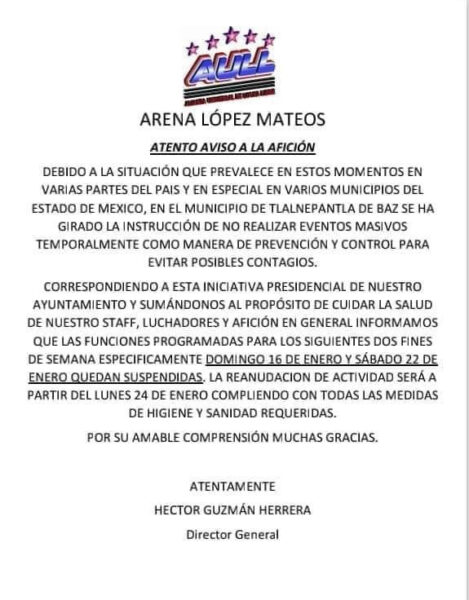 «Sumándonos al propósito de cuidar la salud de nuestro staff, luchadores y afición en general, informamos que las funciones programadas para los siguientes dos fines de semana, domingo 16 de enero y sábado 22 de enero, quedan suspendidas».