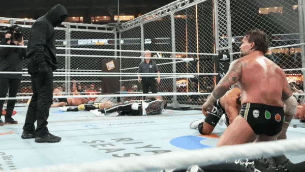Cuando todo estaba por decidirse entre CM Punk y Bron Breakker, un individuo encapuchado y con pasamontañas entró en escena y defenestró al actual Campeón Mundial de Peso Completo WWE vía Superkick y Stomp, para seguidamente marcharse. Punk quedó así a merced de Breakker, que le endosó una Spear y lo cubrió, permitiendo que el quinteto rudo saliera victorioso.