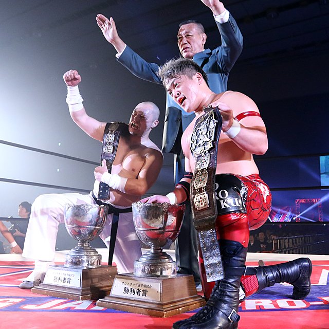 Jake Lee y Koji Iwamoto de AJPW, cayeron en su primera defensa del Campeonato de Parejas All Asia ante el equipo de BJW (Ryuichi Kawakami y Kazumi Kikuta) ante el beneplácito de Great Kojika.