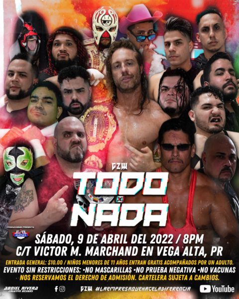 La empresa GZW (Ground Zero Wrestling) presenta Todo X Nada este próximo sábado 9 de abril en la Cancha Victor M. Marchand en Vega Alta, PR desde las 8:00 PM. Los boletos los puedes conseguir desde ya llamando al 787-566-6944 o 787-610-0906 y el mismo día del evento en la boletaría.