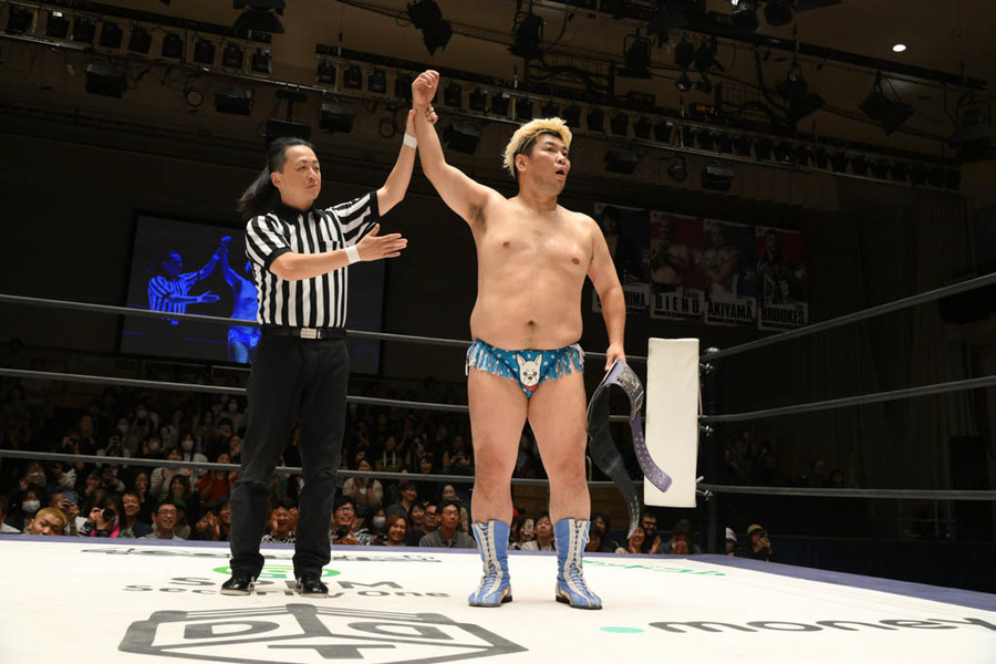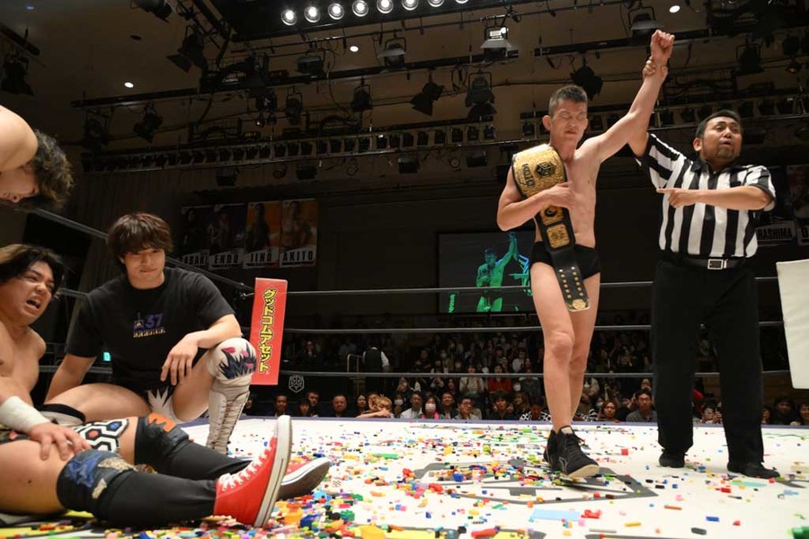 Con nueve reglas especiales, Danshoku Dino (con su perro Haku) se apoderó del Campeonato Extremo DDT doblegando a Akito.