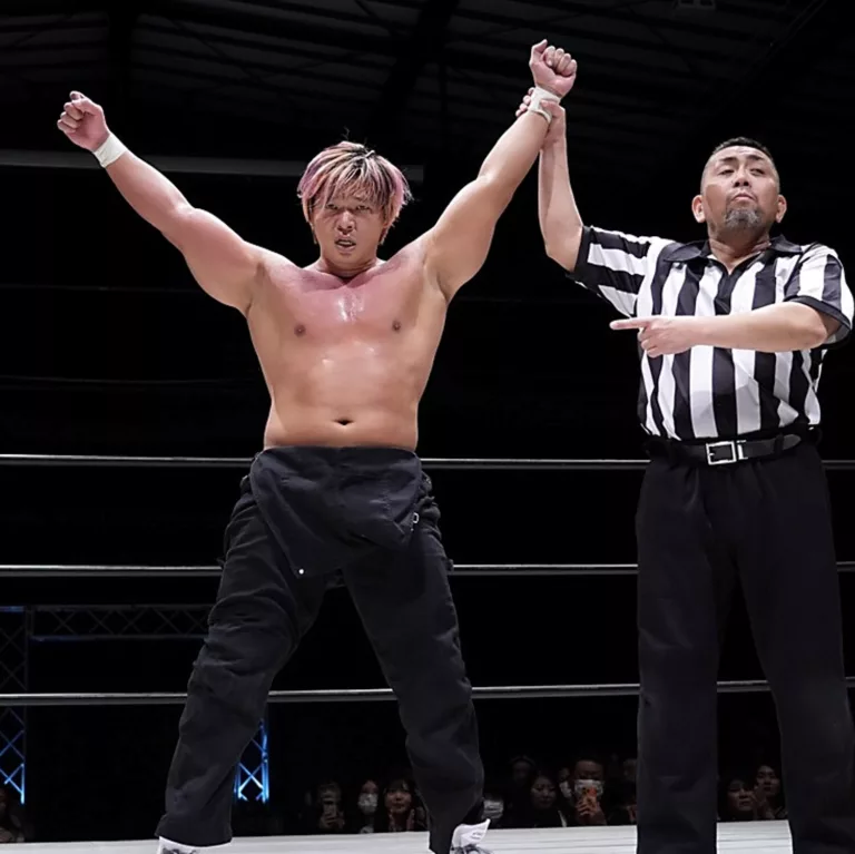 2) Kazuma Sumi venció a Akito (6:52) lanzándolo por encima de la tercera cuerda.