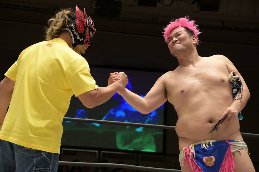Después del combate, El Desperado sorpendió a los presentes ingresando al ring mientras que Makoto Oishi le devolvía a Dino algunas de las cosas que usó para la lucha.