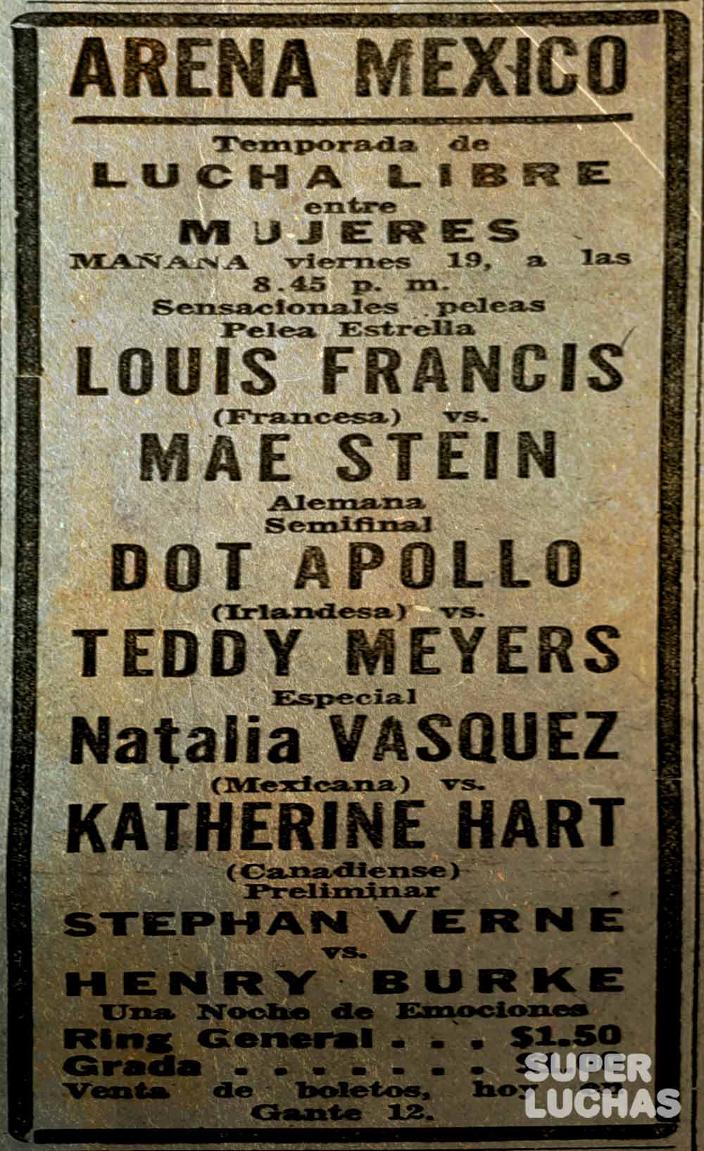 Un día después, Frank Mosser, quien había rentado la Arena México, arrancó su propia temporada con una troupe de luchadoras llegadas de Estados Unidos: Mae Stein, Louise Francis, Dot Apollo, Teddy Mayers, Katherine Hart y Pauline White. Sin embargo, esta última no podría viajar debido a un accidente automovilístico, así que se anunció que su remplazo sería nada menos que una mexicana llamada Natalia Vázquez.