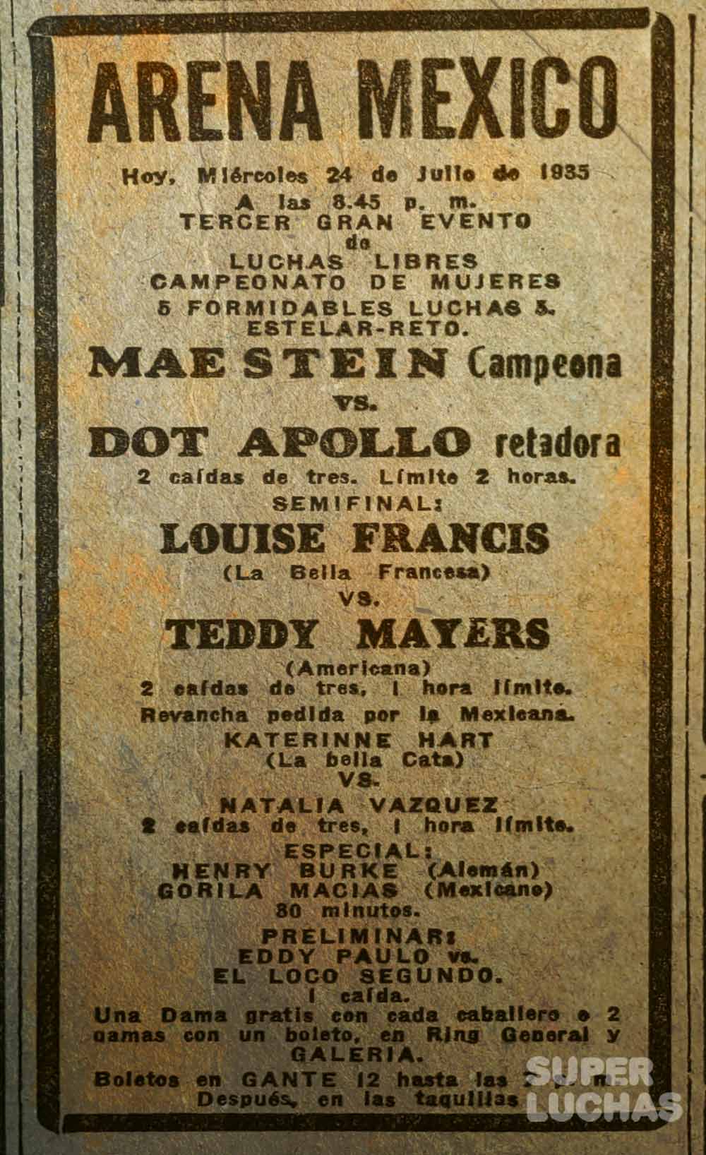 La tercera función femenil fue en miércoles. Ese día, 24 de julio, Mae Stein expuso el título ante Dot Apollo. En la semifinal, Louise Francis contra Teddy Meyers. En la especial, Natalia Vázquez contra Katherine Hart, a quien ya anunciaban en los carteles como ‘La Bella Cata’. En una preliminar, Henry Burke contra Gorila Macías; en la otra, Eddy Palau contra El Loco Segundo.