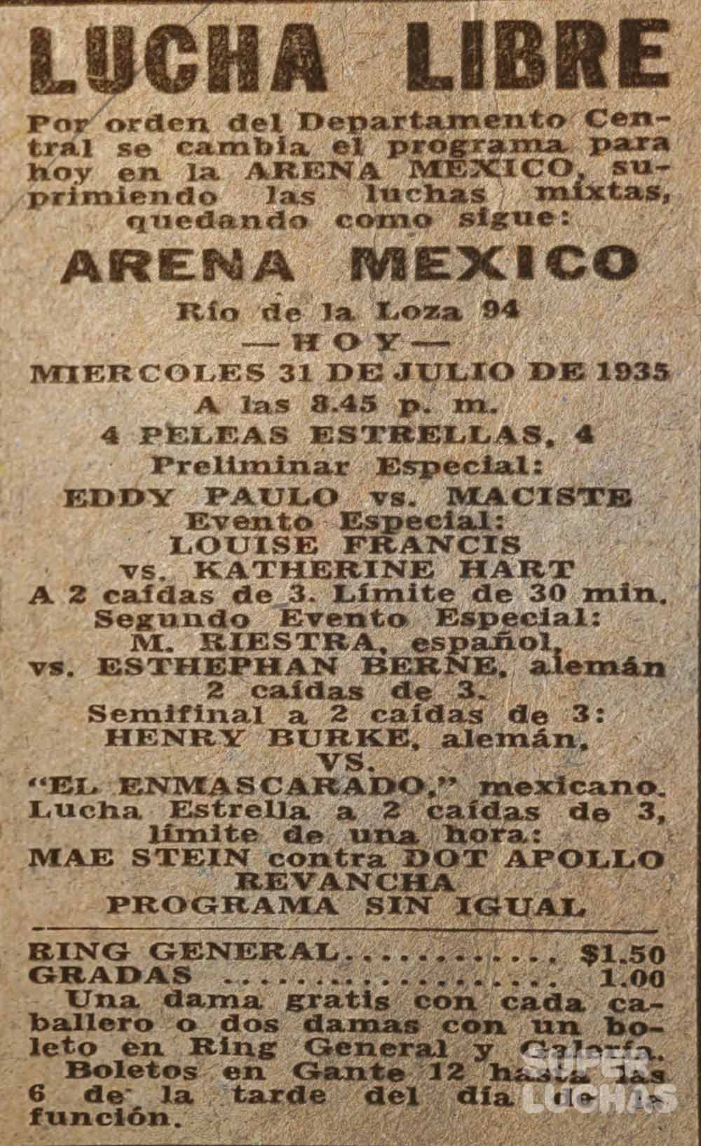 Frank Mosser esperaba su mejor entrada para el miércoles 31, pues programó dos luchas mixtas: Una, Dot Apollo contra Henry Burke. Otra: Teddy Meyers contra El Enmascarado. Sin embargo, por orden del Departamento Central, fueron suprimidos esos combates y hubo que hacer cambios. El cartel original no se anunció por completo, pero se especulaba que Natalia Vázquez enfrentaría a Mae Stein por el campeonato. Sin embargo, todo indica que Stein iba a enfrentar a Tigre Hernández en otro duelo mixto.