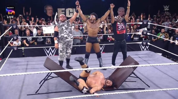 En un momento crucial, Trick recuperó la ofensiva y conectó varias patadas a sus rivales, aunque no fue suficiente para mantener el dominio. Finalmente, Ridge Holland aprovechó una distracción para sorprender a Trick Williams con una enredadera, asegurando la victoria con el toque de espaldas.