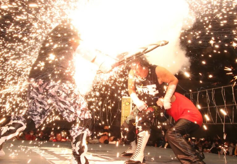 Ingresaron todos los combatientes y se armó un verdadero pandemonium ya que al estrellarse contra las cuerdas provocaban sendas explosiones. Onita y Pogo llevaban la peor parte y en un momento determinado ambos cayeron hacia el tablero con las minas provocando un gran estruendo. Los auxiliares rociaron a los dos luchadores con agua para apagar las llamas.