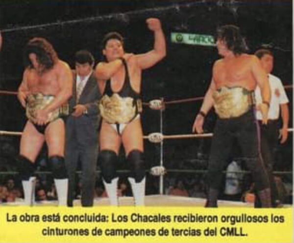 - 1995: Los Chacales (Bestia Salvaje, Emilio Charles Jr. y Sangre Chicana) ganan el Campeonato Mundial de Tercias a La Ola Blanca (Dr. Wagner Jr., El Gran Markus Jr. y El Hijo del Gladiador) en un programa emitido en Televisa.