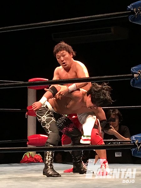 3. Kotaro Yoshino y Dinosaur Takuma vencieron a Tank Nagai y Tatsuya Hanami (10:45) con la Niku Shibori de Yoshino sobre Hanami.