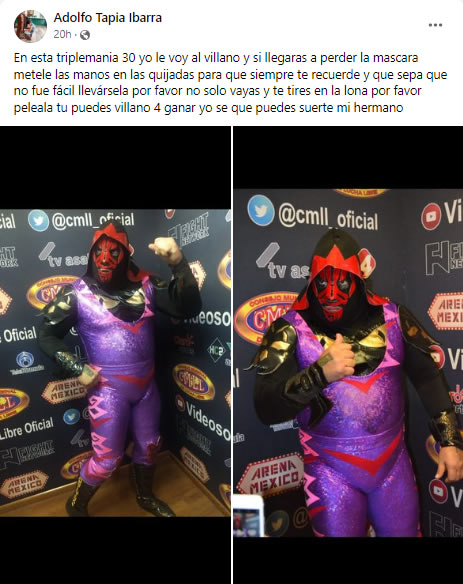 «En esta Triplemanía 30 yo le voy al Villano, y si llegaras a perder la máscara métele las manos en las quijadas, para que siempre te recuerde y que sepa que no fue fácil llevársela, por favor, no solo vayas y te tires en la lona por favor peléala, tú puedes Villano IV ganar (sic), yo sé que puedes suerte, mi hermano«.