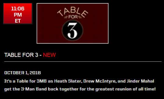 «¡Un Table for 3MB! ¡Cuando Heath Slater, Drew McIntyre y Jinder Mahal traigan de vuelta a la Banda de 3 Hombres para la mayor reunión de todos los tiempos!«