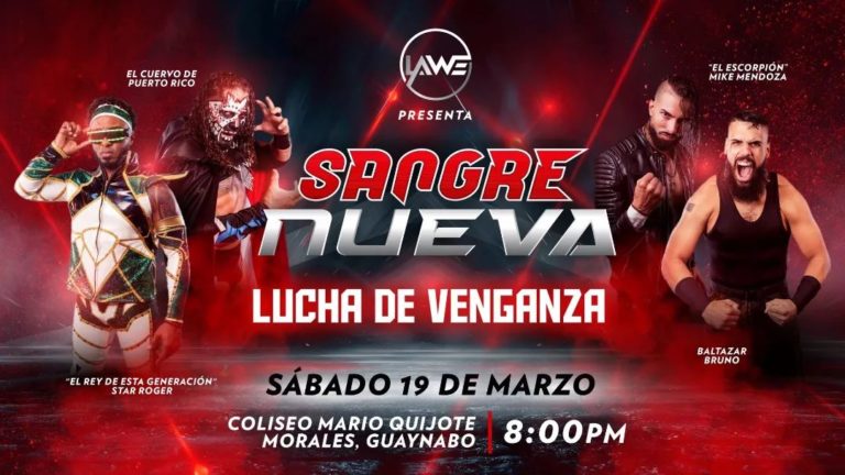 La empresa LAWE (Latin American Wrestling Entertainment) presenta su próximo evento Sangre Nueva este Sabado 19 de Marzo en el Coliseo Mario Quijote Morales de Guaynabo, Puerto Rico desde las 8:00 pm. La empresa continua con el torneo para sacar al primer campeón peso completo de LAWE.